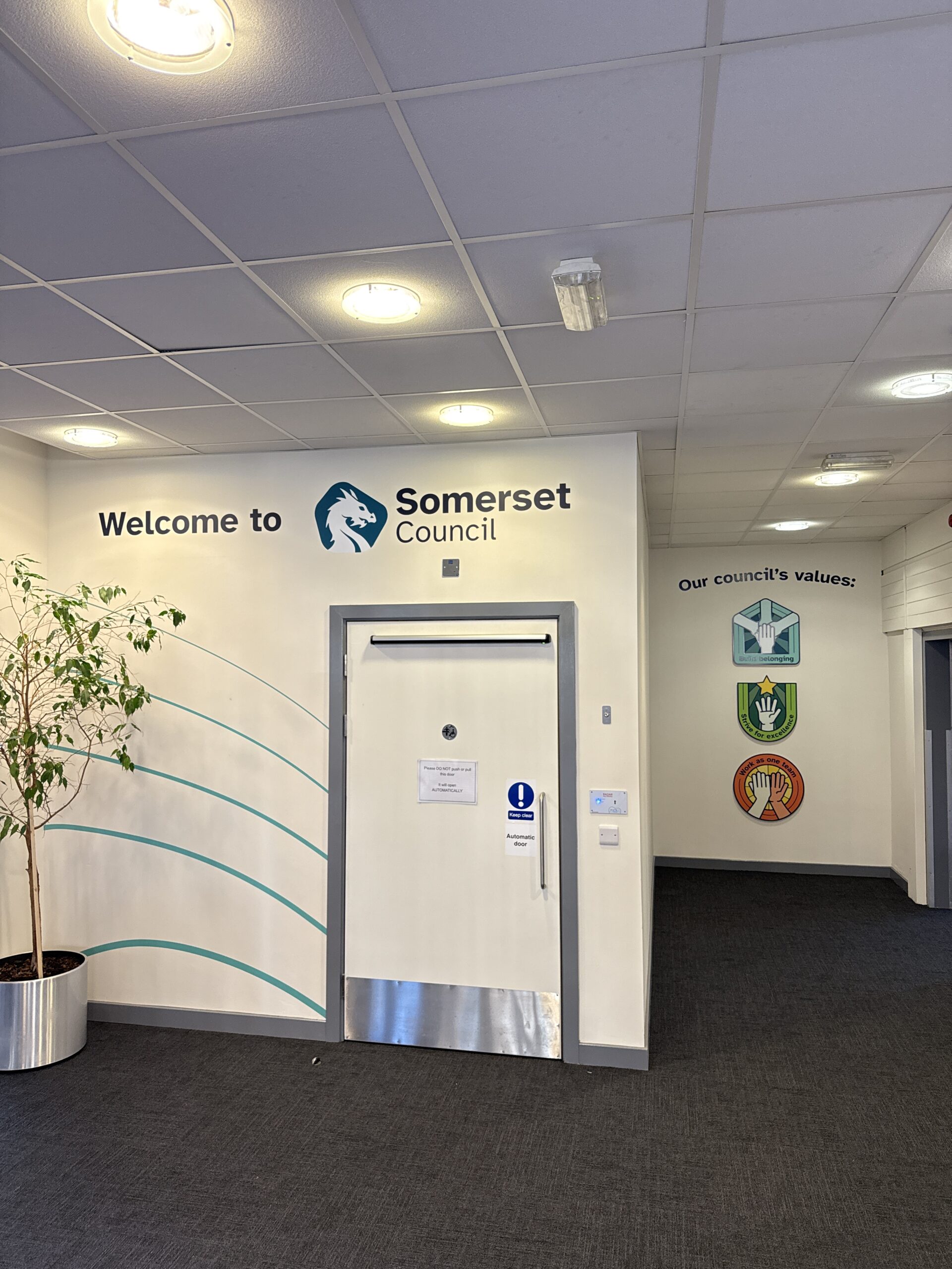 We're pleased to have delivered another brilliant project for our long-standing client, Somerset Council. We were invited to collaborate with their in-house design team to transform the reception area with a bold, on-brand wall graphic and to help bring their new internal values to life throughout the building.